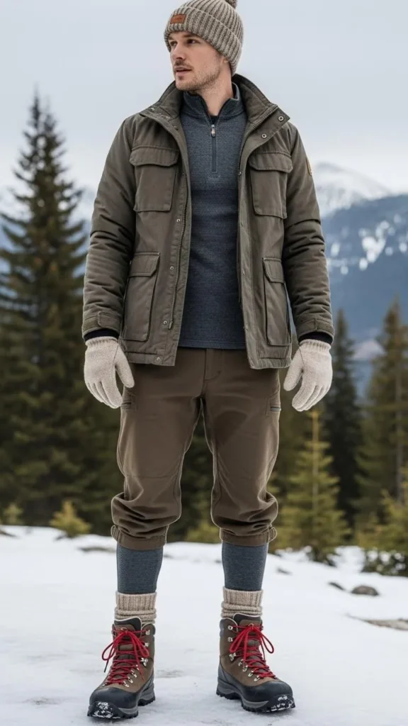 Hiking boots work well for cold walks. Pair them with thermal leggings and a utility jacket. Focus on warmth and comfort. Add thick socks for insulation. This outfit suits outdoor days and travel.