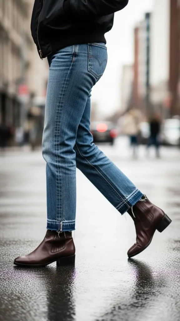 Ankle boots with straight jeans create a clean everyday look. Choose jeans that fall just above the boot top. This avoids bunching and keeps lines neat. A basic sweater or long sleeve tee works well on top. Add a simple jacket for warmth. Black or brown boots are easy to repeat with many outfits. If jeans are too long, cuff them once. No tailoring needed. You can also trim old jeans with scissors for a raw edge. For budget styling, focus on fit instead of brand names. This outfit feels right for workdays, coffee runs, or casual plans. Add a crossbody bag to keep things practical.
