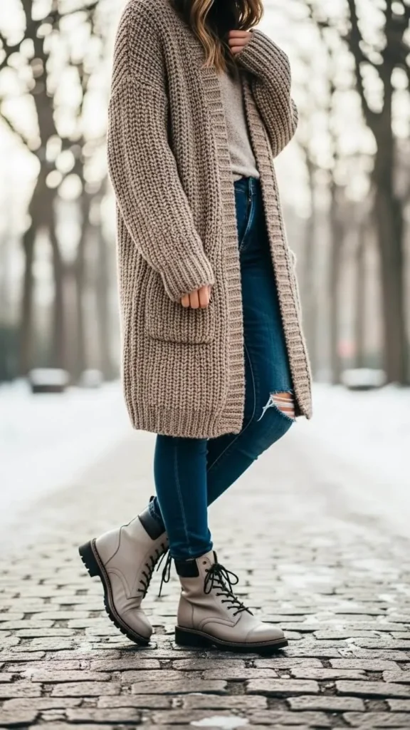 Lace up boots feel classic. Pair them with jeans and a long cardigan. This outfit works for daily wear. Add layers as needed.