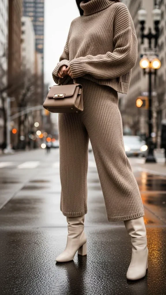 Faux leather boots feel polished. Wear them with knit sets for comfort. This outfit works for travel and casual plans.