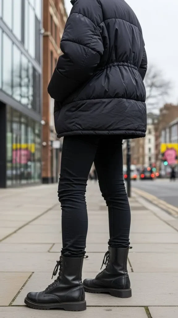 Combat boots add strength to winter outfits. Pair them with a puffer jacket and slim pants. The mix feels balanced and comfortable. Stick to dark colors for an easy match. If your jacket feels bulky, keep layers underneath light. A fitted hoodie works well. Combat boots often last years, making them a smart buy. If you want a softer feel, lace them loosely. For icy days, add grip pads to the sole. This outfit suits long walks and cold mornings. A beanie finishes the look without effort.