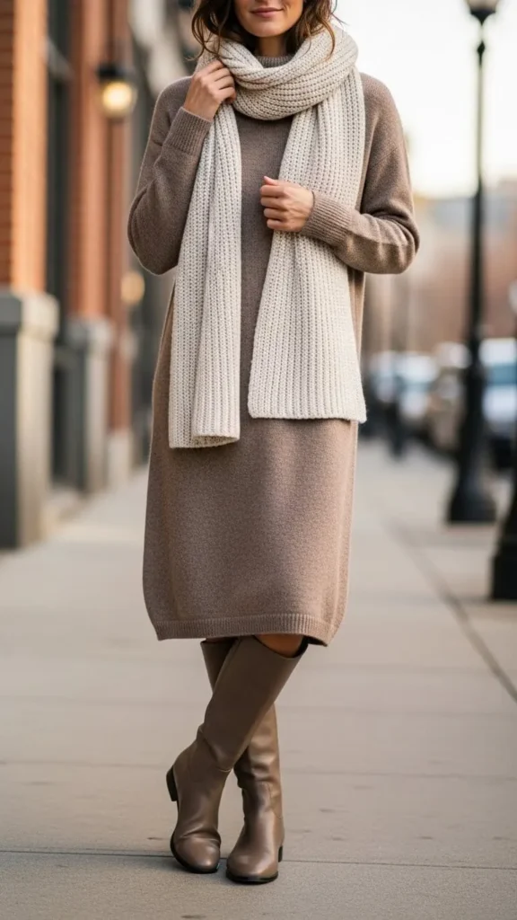 Flat boots and knit dresses feel easy and warm. Choose a dress that skims the body. Add a belt if you want shape. Flat boots keep walking comfortable. This outfit suits daily wear and travel. Layer with a long coat for warmth.