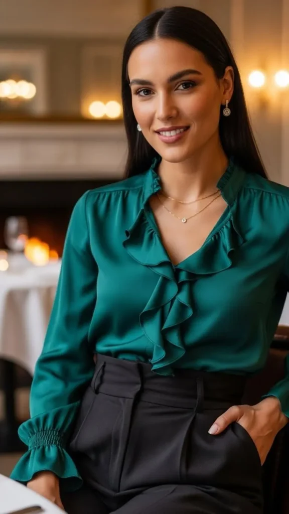 A soft blouse with high-waist trousers feels romantic and polished, making it great for dinner dates. Choose a blouse with gentle fabric that feels nice on your skin. High-waist trousers add comfort and shape, and a warm coat completes the outfit. Simple blouses are affordable, so focus on fabric feel rather than design. Tucking in the blouse slightly and adding a belt changes the look easily. Low heels or flats keep it wearable.