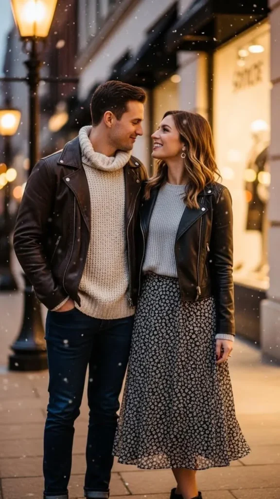 A leather jacket paired with a knit top mixes warmth with a bit of edge, making it suitable for evening dates. Choose a soft knit underneath and keep the colors simple. Faux leather jackets are affordable and warm, making them a good option. Adding a scarf inside the jacket increases warmth without changing the style. Jeans and boots complete the outfit well.