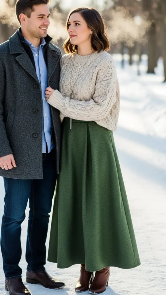 A maxi skirt with a chunky sweater feels cozy and romantic while keeping you warm. The long skirt helps block the cold, especially when paired with soft fabrics. Adding tights underneath makes it even warmer. Maxi skirts are easy to find second hand, which helps keep costs low. Knotting the sweater slightly at the side adds shape and interest. Ankle boots work perfectly with this look.