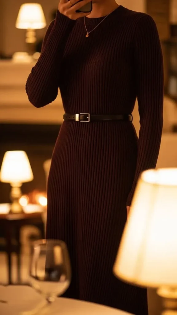 A ribbed dress with a belt feels soft and flattering, making it suitable for many types of dates. Ribbed dresses are affordable basics that work well in winter. Using a belt you already own defines the waist and changes the look easily. Boots complete the outfit and keep it practical.