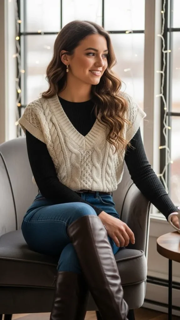 A knit vest layered over a long sleeve top adds warmth without bulk. Knit vests are affordable and easy to style with items you already own. Pairing this look with jeans keeps it casual and comfortable for daytime dates.