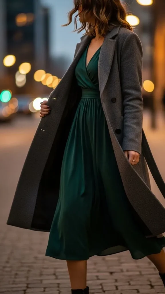A long wool coat over a midi dress feels romantic without trying too hard. The dress adds softness while the coat brings warmth and structure, making this outfit great for dinner dates or evening events. Choose a midi dress with a comfortable fabric that does not cling. A simple shape works best, and the coat should fall below the knee for extra warmth. Second hand shops often have barely worn wool coats that last for years. If the dress feels light, thermal leggings underneath solve the problem without showing. Finish the look with ankle boots or low heels that are easy to walk in.