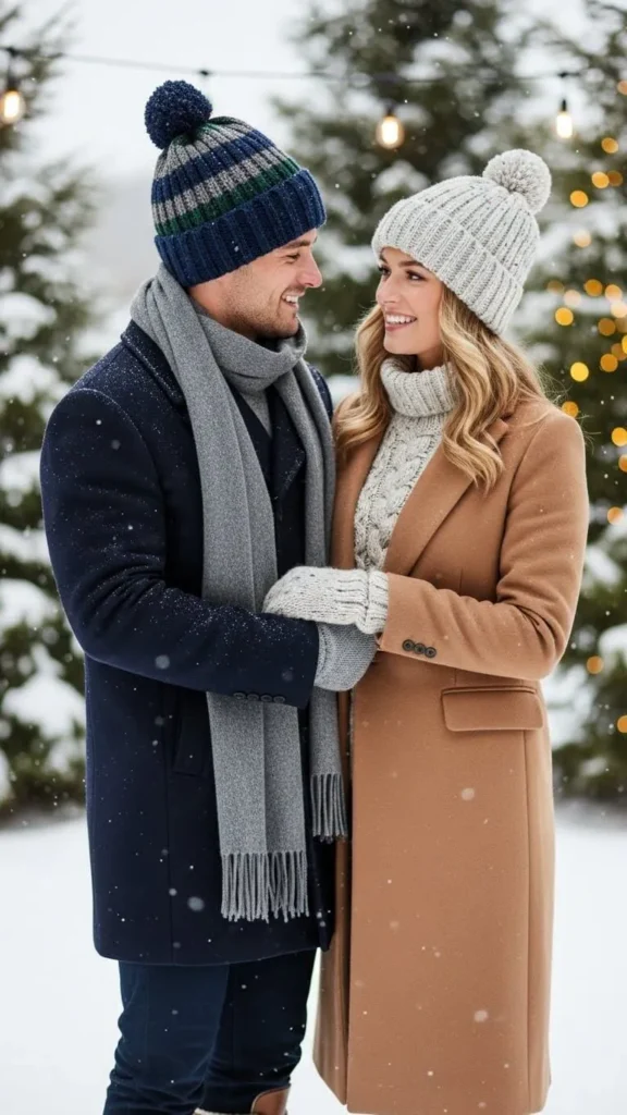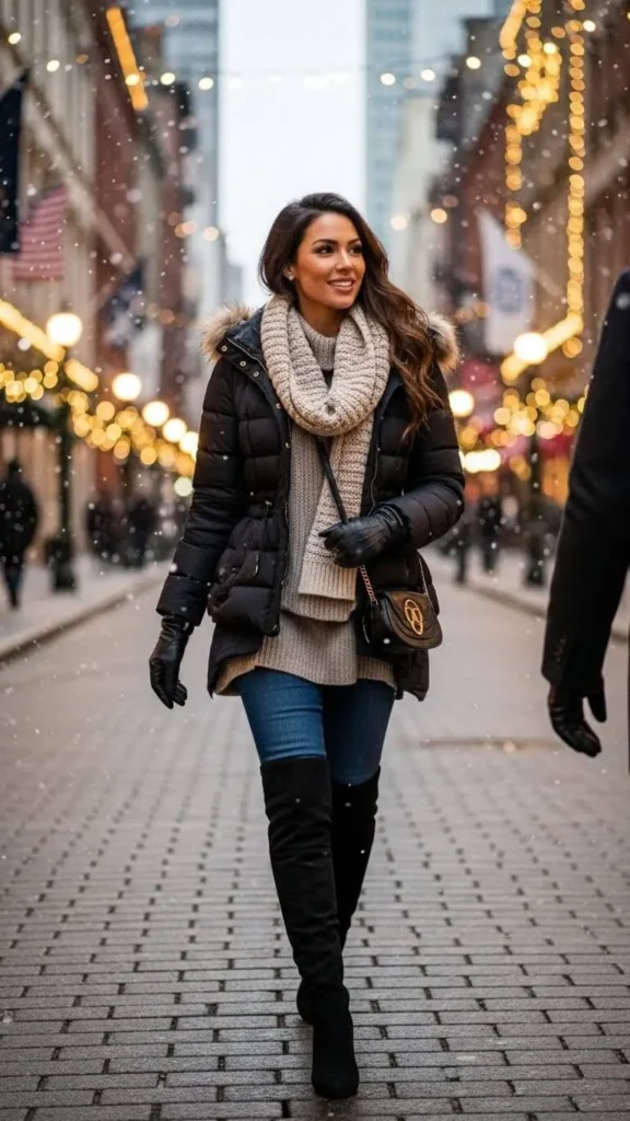 A cable knit sweater dress is warm and romantic while still looking put together. It works well for dinner dates or winter walks. Choose a length that hits just above or below the knee and add thick tights for warmth. The cable texture adds interest, so extra accessories are not needed. Sweater dresses often appear during off-season sales, especially in neutral colors. A wide scarf worn as a wrap keeps you warmer and adds a soft layer. Knee-high boots or ankle boots finish the outfit comfortably.