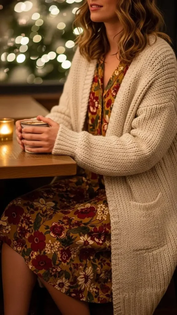 A long cardigan worn over a dress feels relaxed and warm, making it great for winter dates. Long cardigans are easy to find and layer well. Adding a belt creates shape, while boots keep the outfit practical.