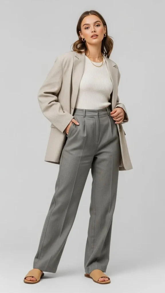 A wool blazer adds warmth and polish when paired with a knit top and jeans. This outfit suits casual dinners or coffee dates. Thrift stores often have good blazers at low prices. Pushing the sleeves up slightly gives a relaxed feel, and flats keep the look comfortable.
