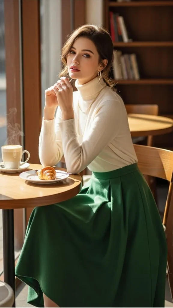 A turtleneck with an A-line skirt creates a sweet winter look that works well for lunch dates or museum visits. The fitted top keeps you warm, while the skirt adds movement and comfort. Choose a turtleneck that is not too tight, since comfort always matters. An A-line skirt allows easy walking and pairs well with tights for extra warmth. Basic turtlenecks are affordable and easy to find, so pick a color you truly like wearing. Adding a simple brooch to the turtleneck gives the outfit a special touch without spending much. Flat boots complete the look and keep it practical.